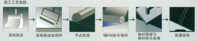施工工艺流程:基层处理→节点细部施工→涂刷基层处理剂→EVA自粘卷材→卷材收头
