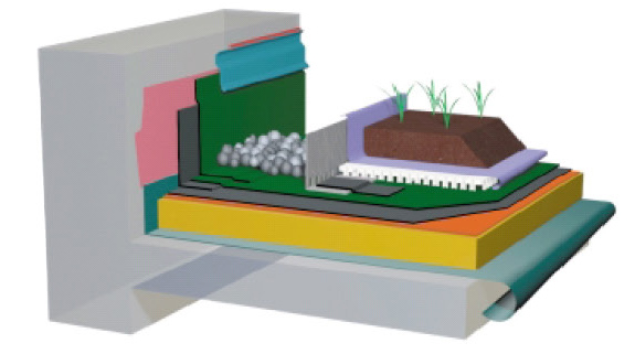 砷植匡面系统王要由以下各部分构成,植被生长介质阻根盖排水过滤层防水屋,保温板和隔汽盖等。下图简要地示意了种植屋面系统的构成。