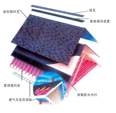 玻纤胎沥青瓦是以玻璃纤维毡为胎体,经浸涂氧化石油沥青等原材料后,一面盖彩色矿物粒料,另一面撒以隔离材料,所制成的瓦状屋面防水片材。