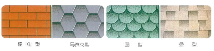 产品分类:玻纤胎沥青瓦分为:标准型、圆型、叠型、马赛克型。